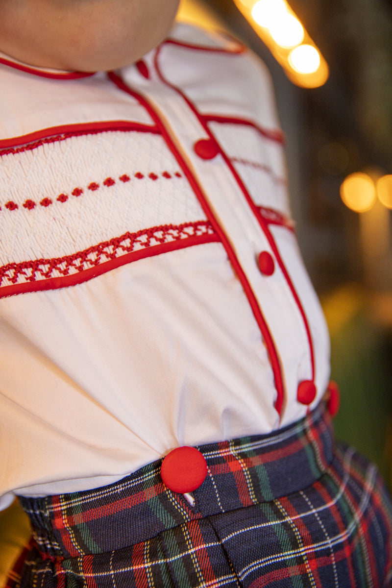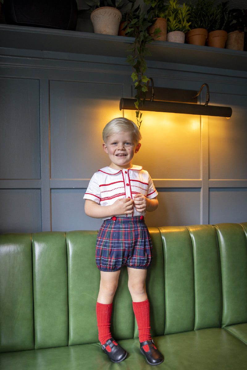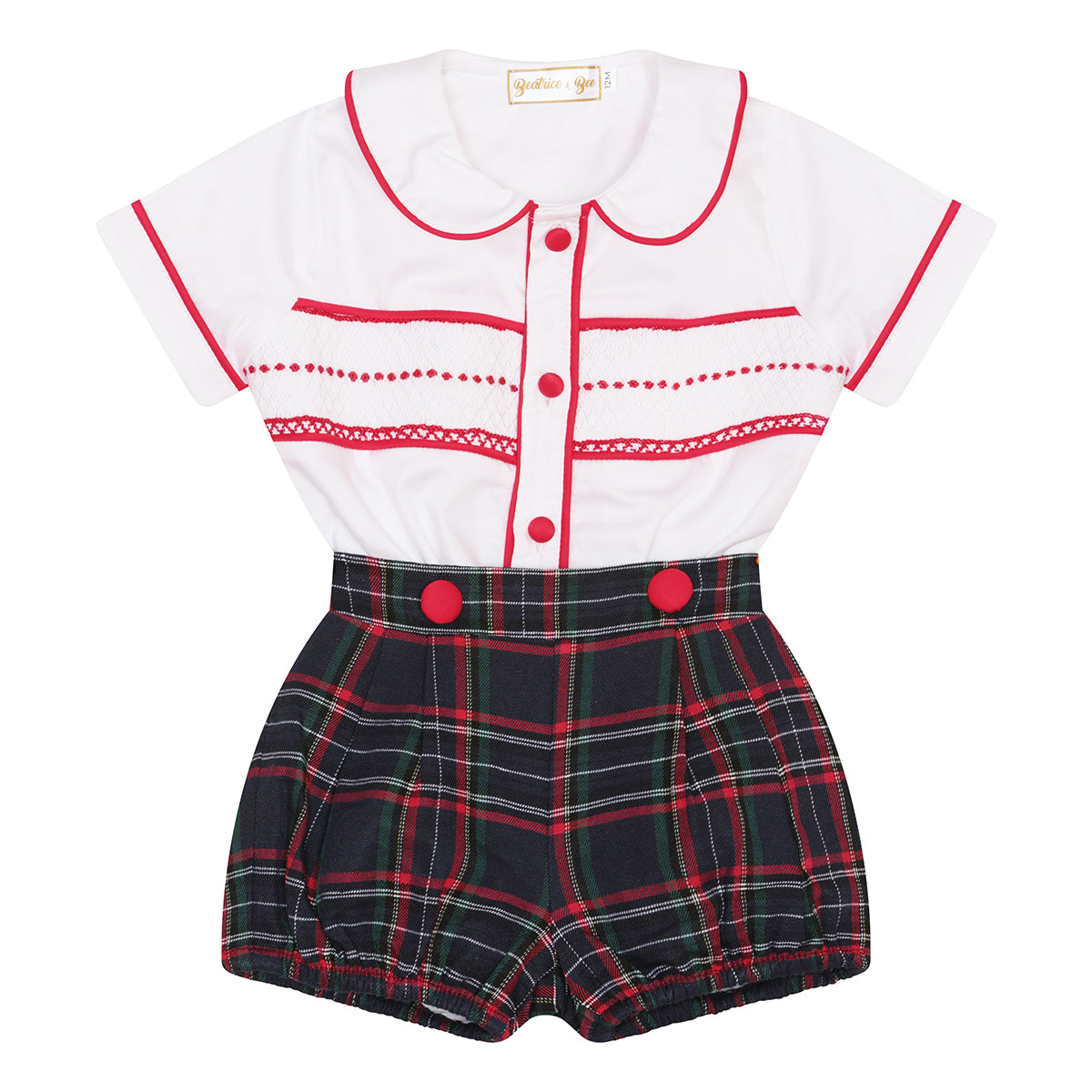 This set features a short sleeve white shirt with Peter Pan collar, red piping, artisanal smocked embroidery and matching red buttons.