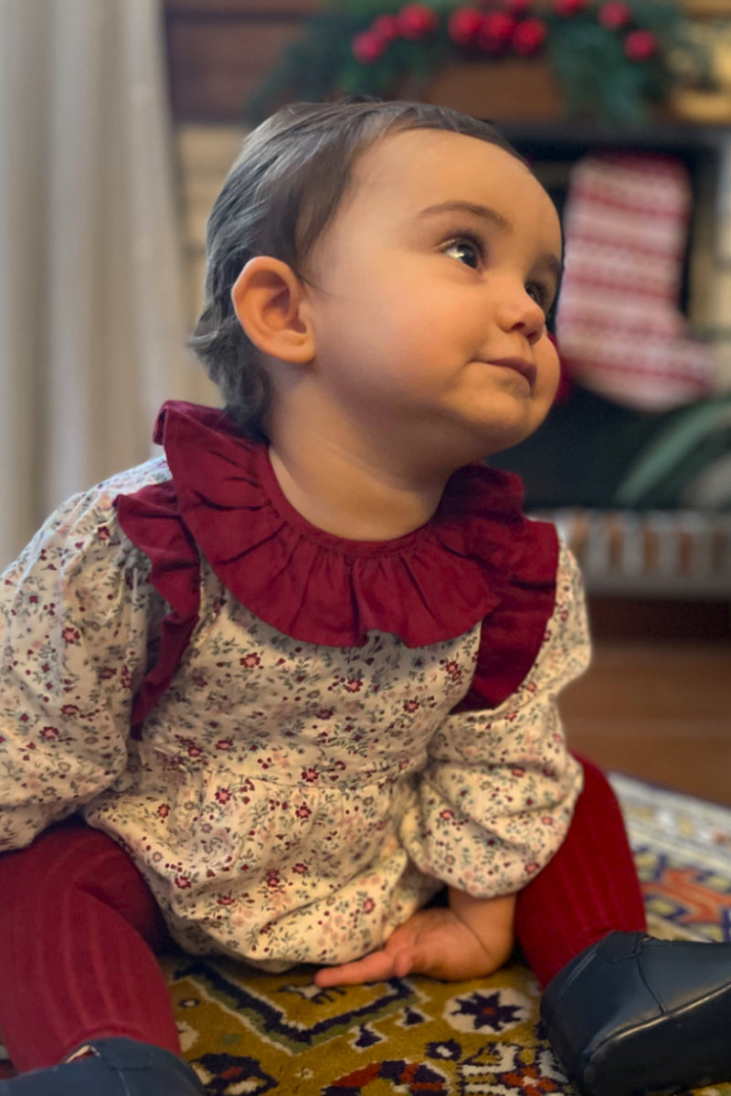 A stunning baby girl romper crafted from 100% organic cotton with floral print in burgundy, pink and green. Featuring contrasting frill collar, ruffles on the sides and belt that ties at the back in burgundy.