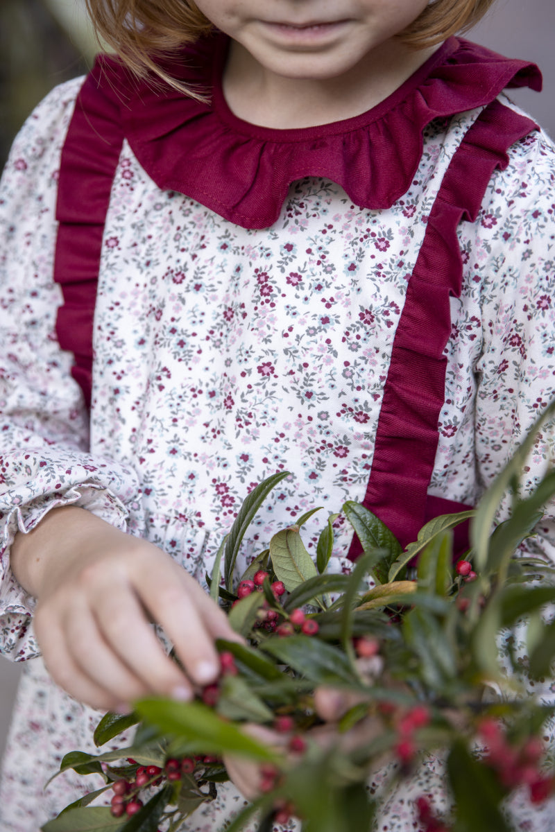 A stunning dress crafted from 100% organic cotton with floral print in burgundy, pink and green. Featuring contrasting frill collar, ruffles on the sides and belt that ties at the back in burgundy.