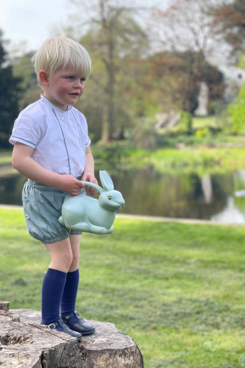 A charming set in white and sage green for the spring-summer wardrobe of your little prince.