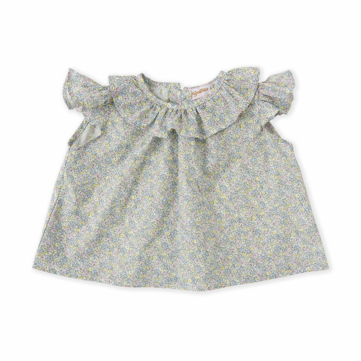 An enchanting floral print blouse with frill detail in the collar and shoulders. Crafted from an eco friendly 100% organic cotton with vintage-inspired florals in shades of blue, lilac and yellow.