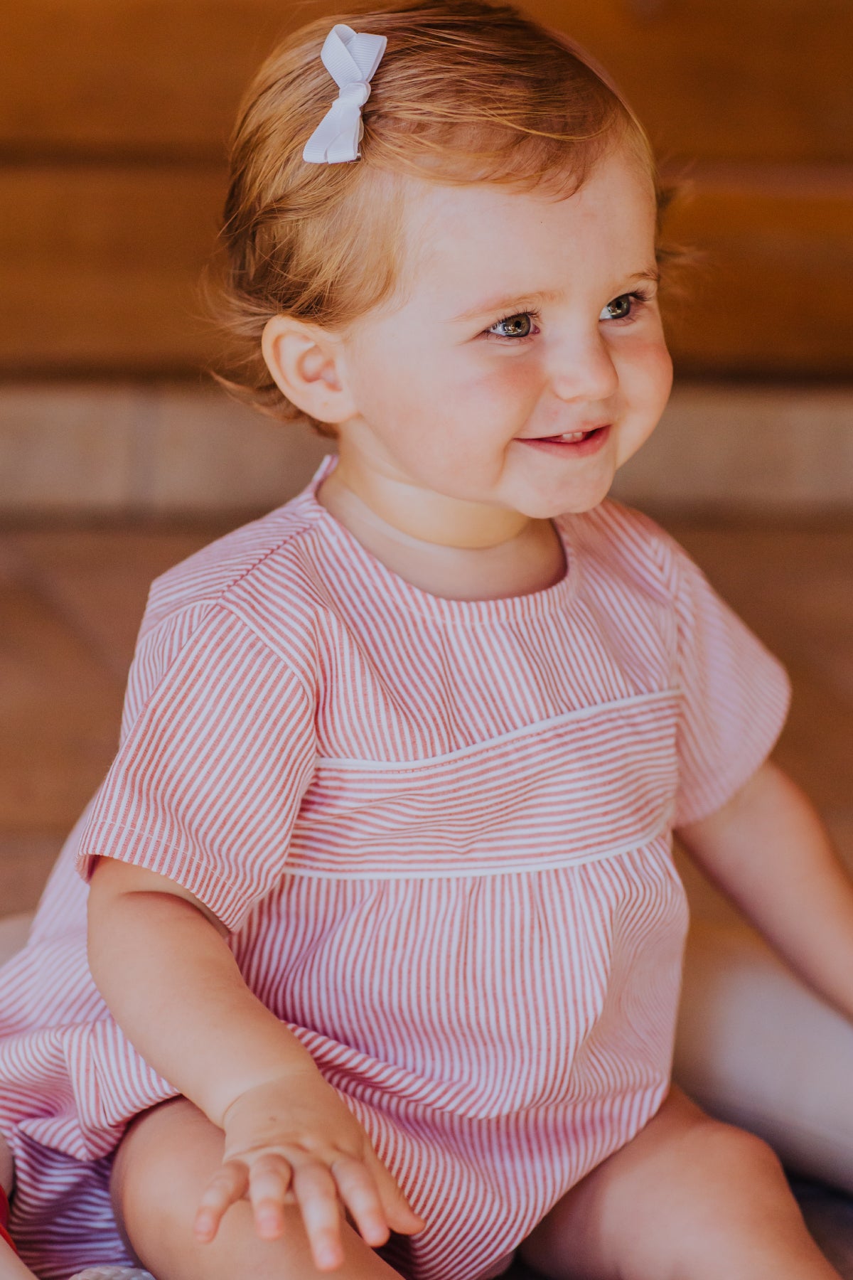 An adorable unisex one-piece in dusty red and white stripe for the summer months.