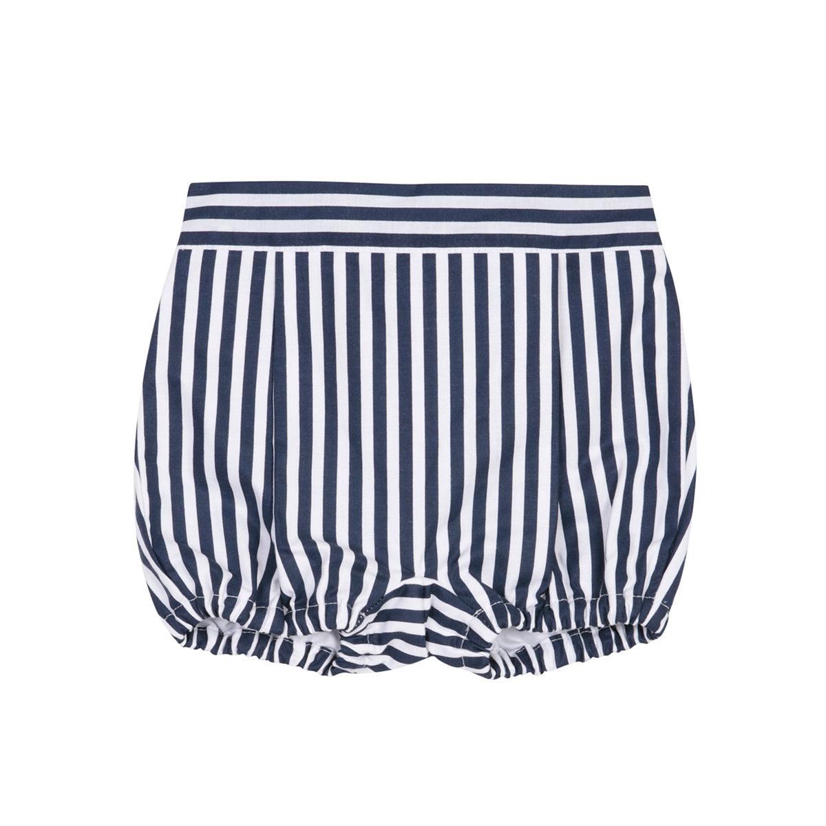 Unisex stripe bloomers in white and navy blue organic cotton. The elasticated waistband and leg holes make this item super comfortable.