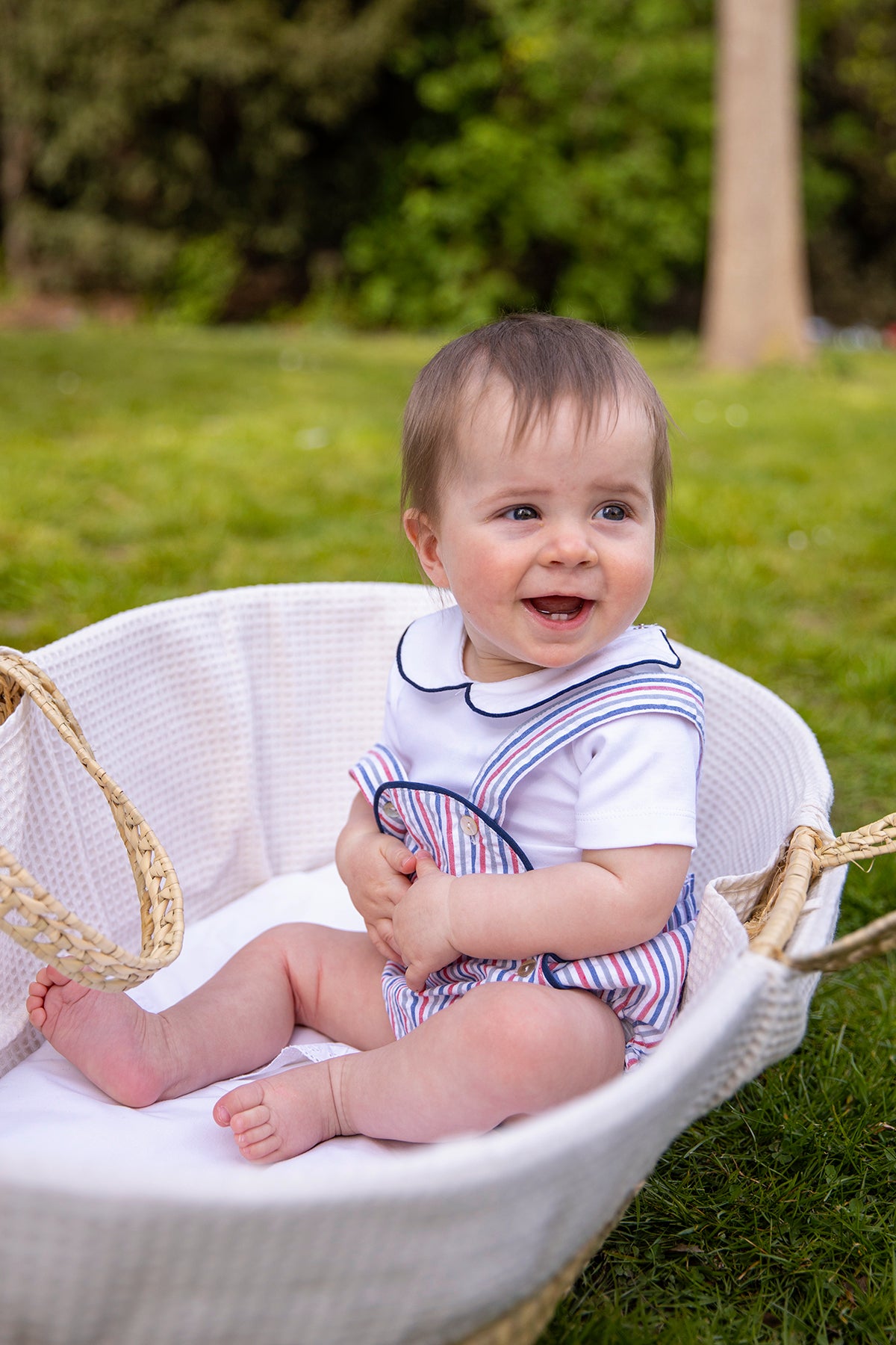 A must-have short sleeve body vest for the spring-summer wardrobe of your baby boy. Featuring a charming Peter Pan collar with navy blue piping around the edge to give contrast.
