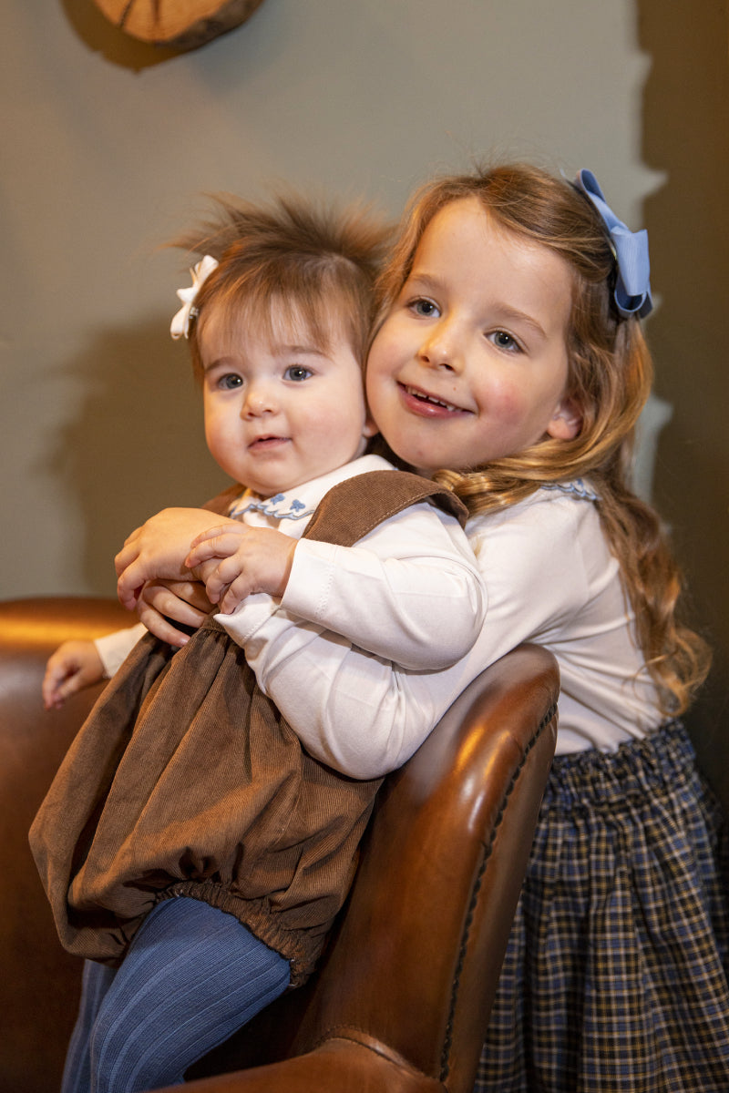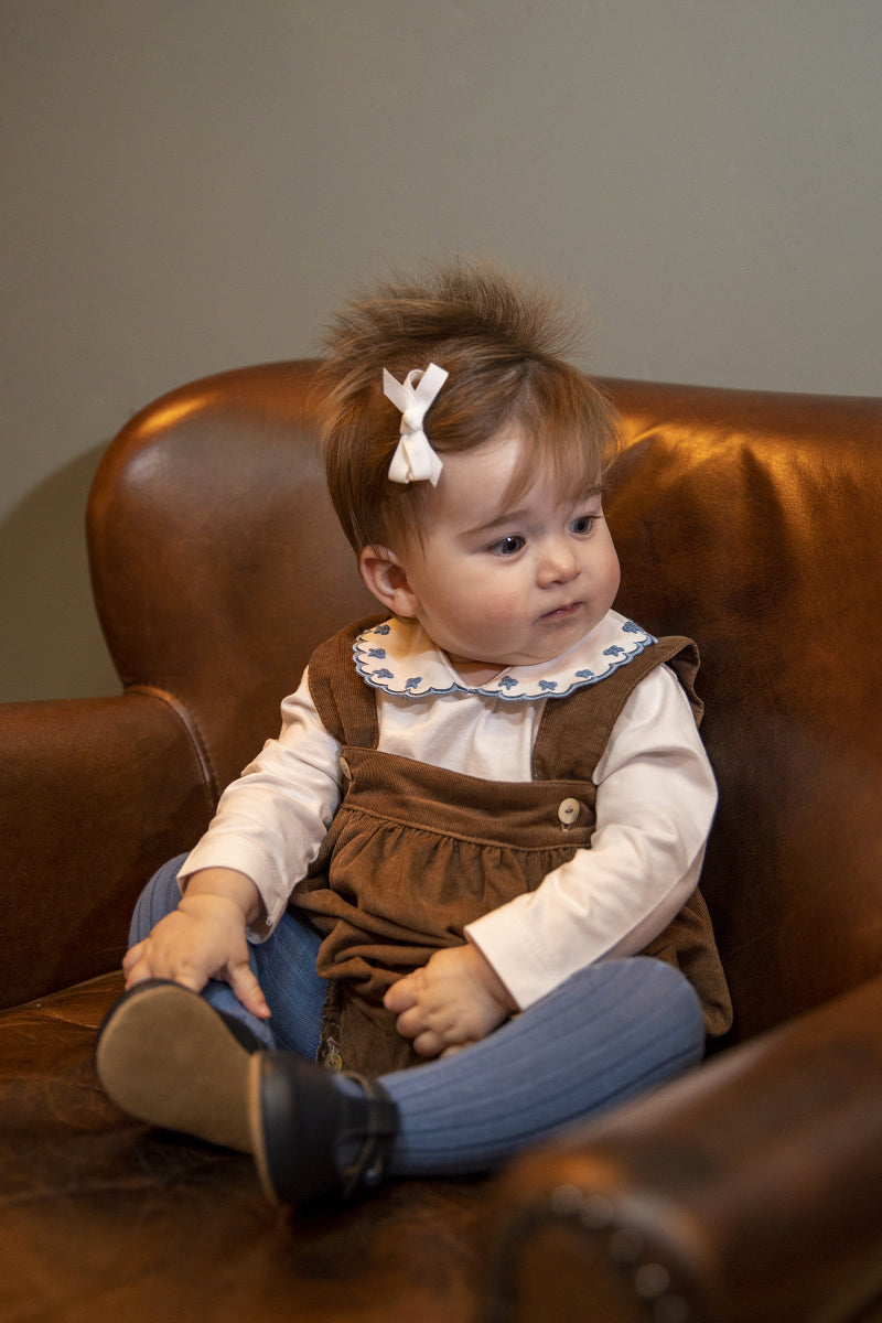 It features snap fastening at the bottom and back for easy changing and a delicate bow embroidery in French Blue as a vintage touch.