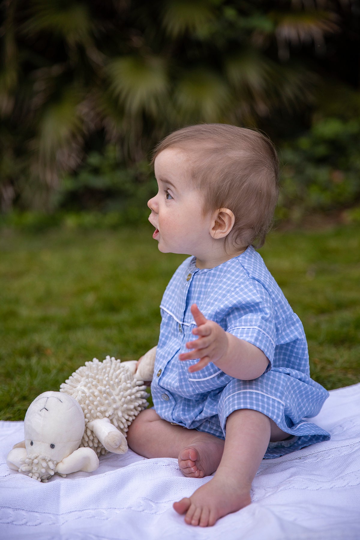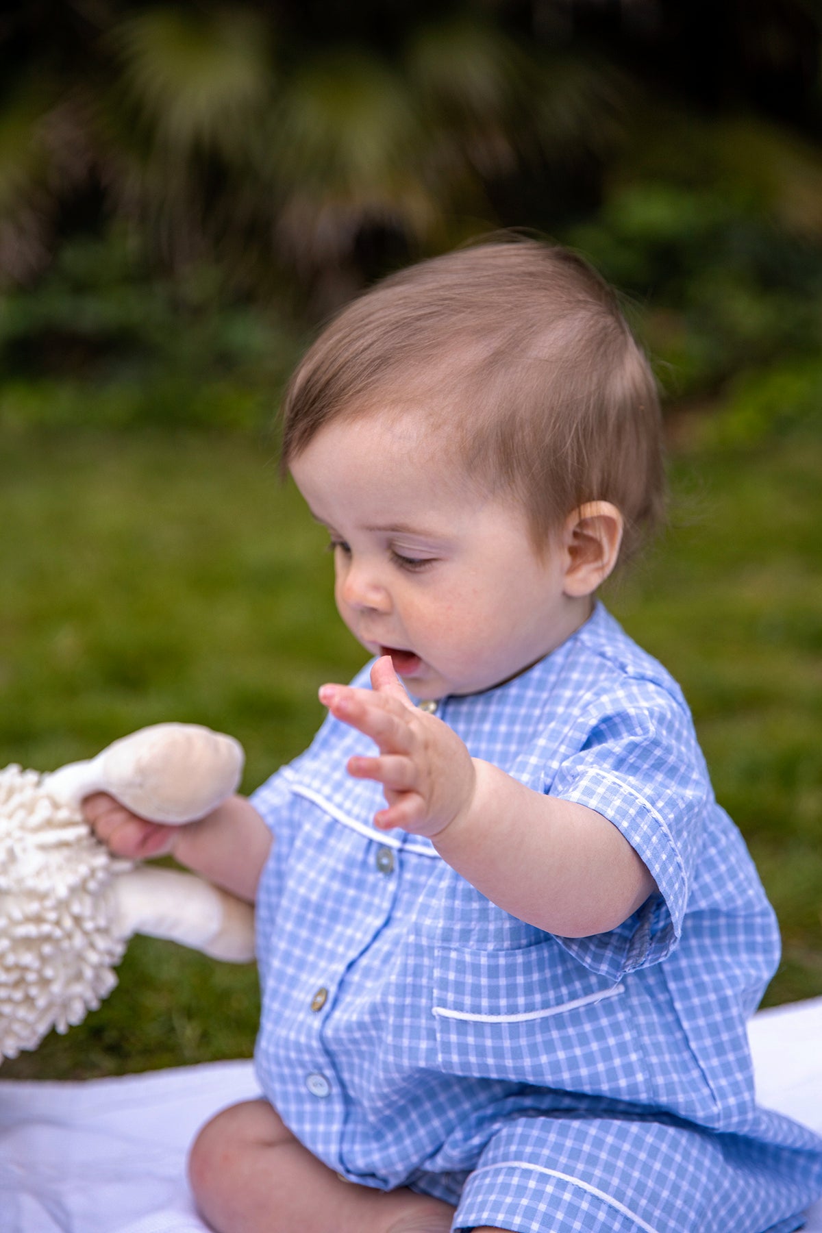 A sweet one-piece check pyjamas in dusty blue embracing timeless vintage elegance. Crafted from a premium super soft organic cotton for total comfort during the night.