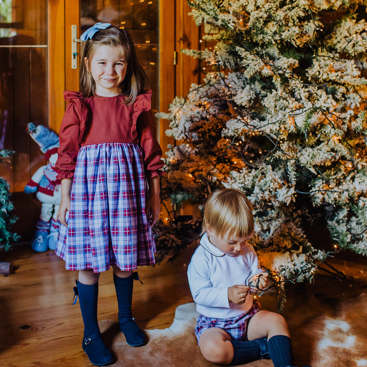 A festive long-sleeved dress in two gorgeous patterns: burgundy on top and tartan print bellow. Includes ruffles shaping the shoulders down at the front and at the back, round neck and ruffled cuffs.