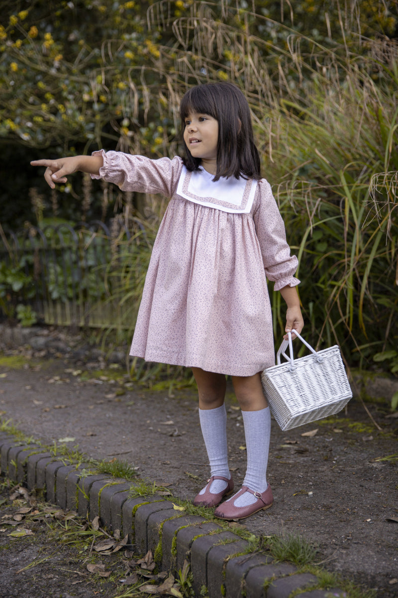 A sweet dusty pink dress with floral print. It comes with an oversized white collar at the front and back with dusty pink piping to add contrast. Featuring elasticated cuffs and beautiful mother of pearl buttons.