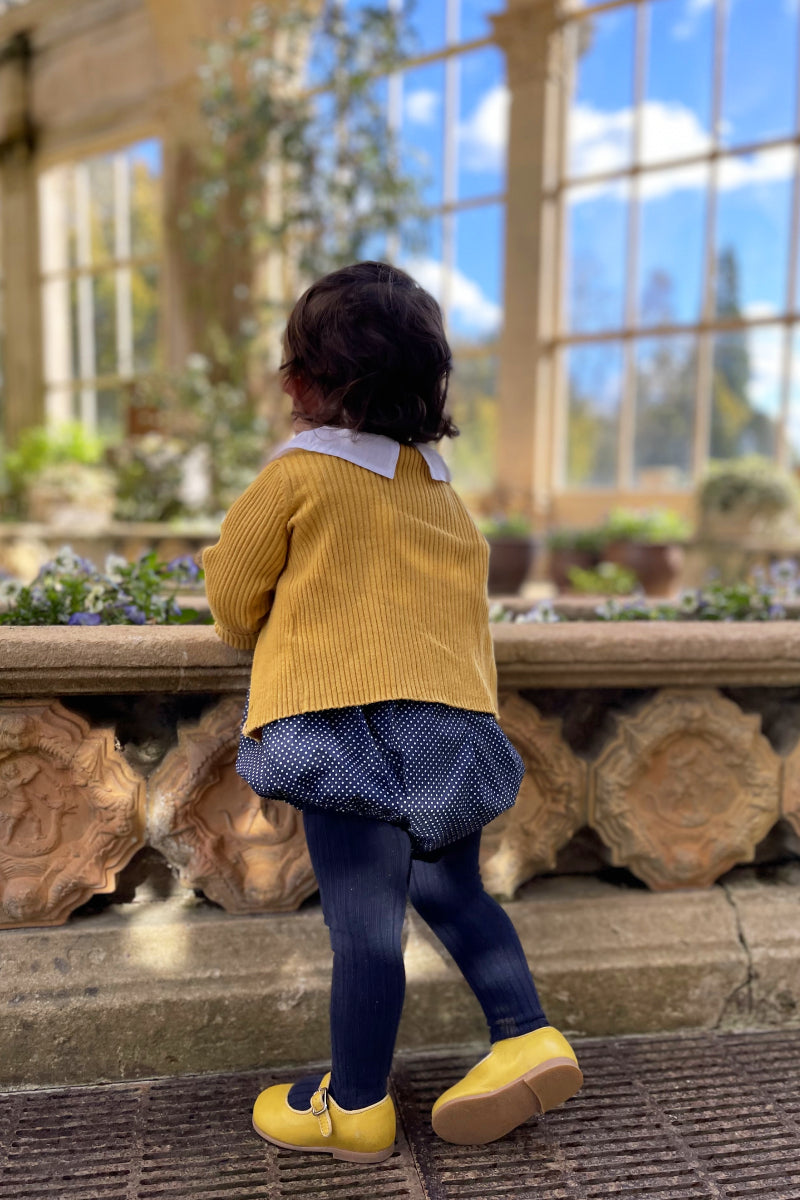 Navy polka dot romper crafted from an eco friendly 100% organic cotton. Finished with a sweet contrasting frill collar in white and ruffle detail in the cuffs.