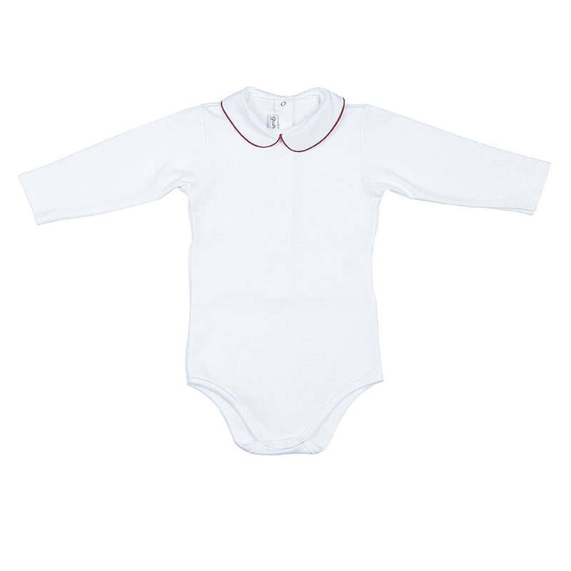 This bodysuit is an essential piece for your baby’s winter wardrobe. Made of soft 100% cotton, features a Peter Pan collar with burgundy piping around the edge.
