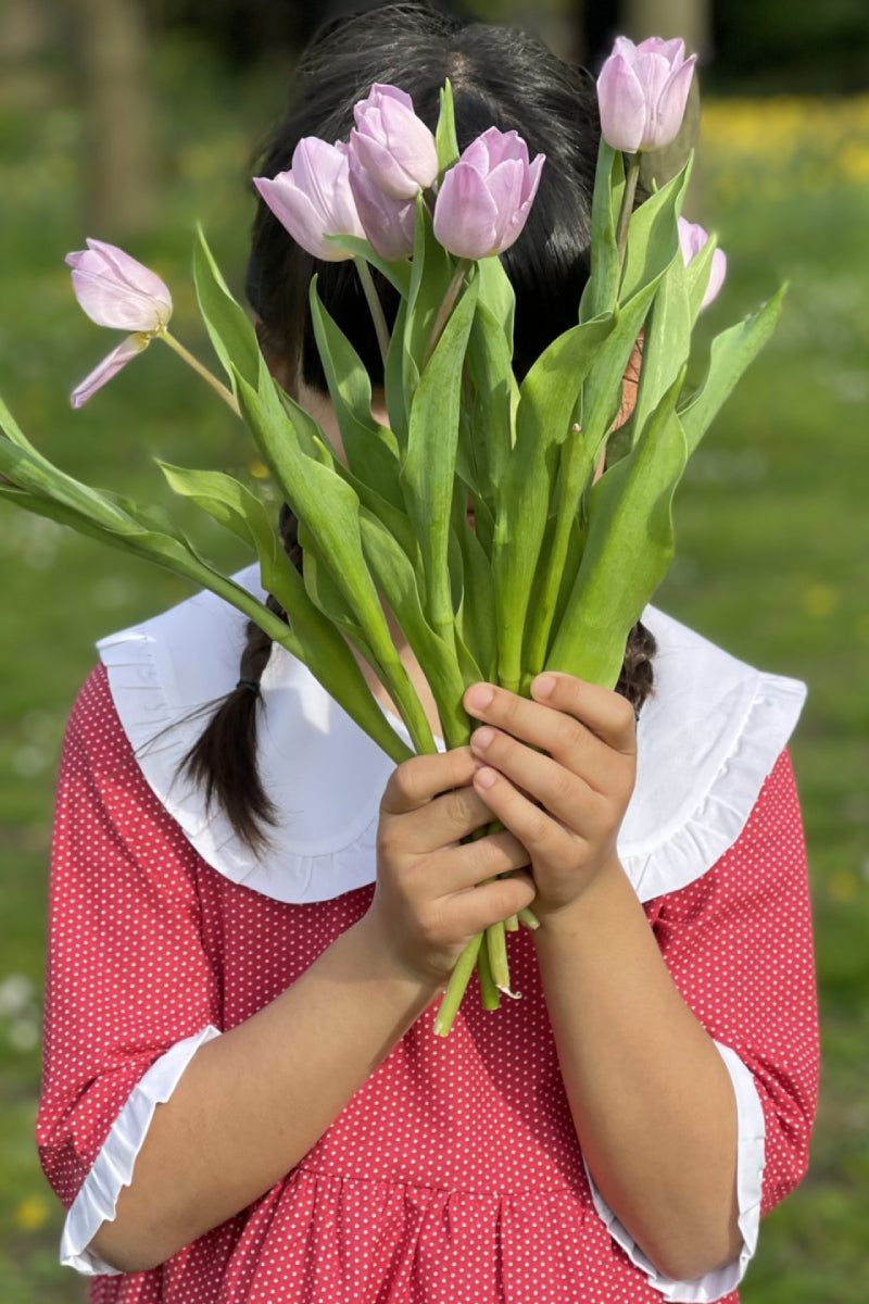 Pair with white ribbed tights and red hair bow for a complete outfit.