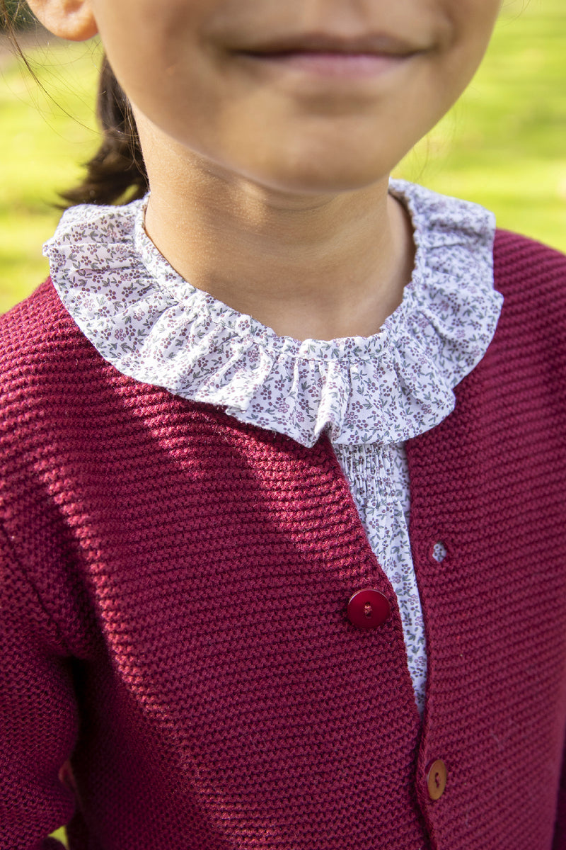 A charming frill collar blouse with delicate florals in burgundy and green and shirred detail at the front.