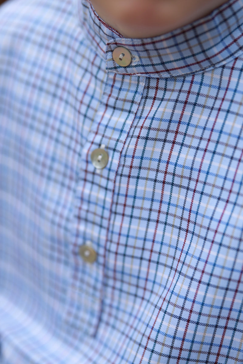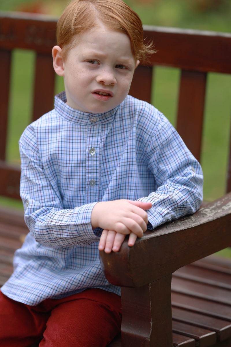 Classic and comfortable boy check shirt in light blue with stripes in dusty blue, burgundy and beige.