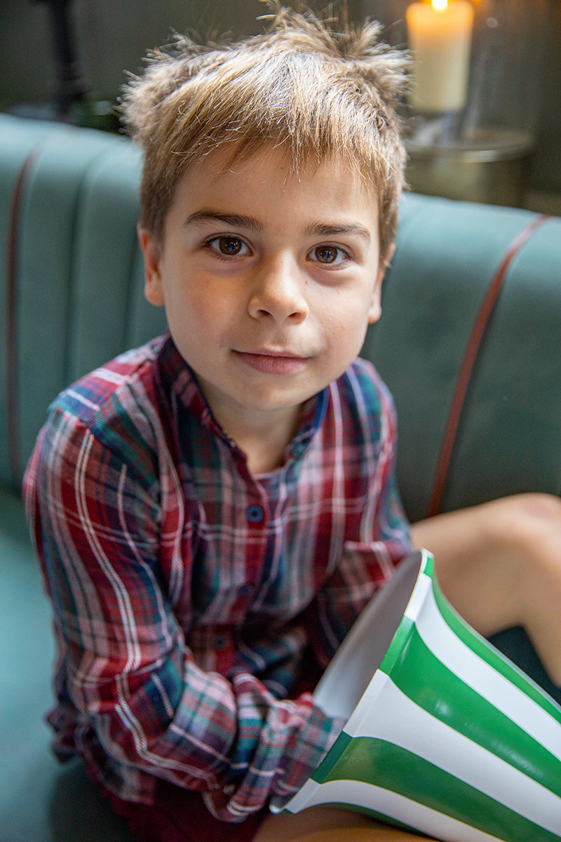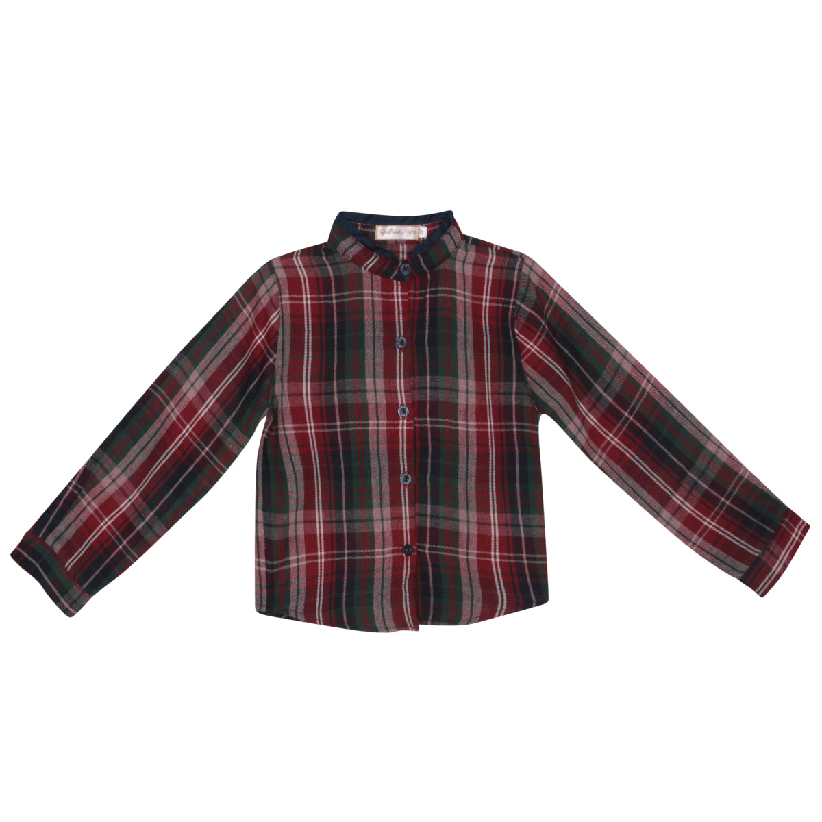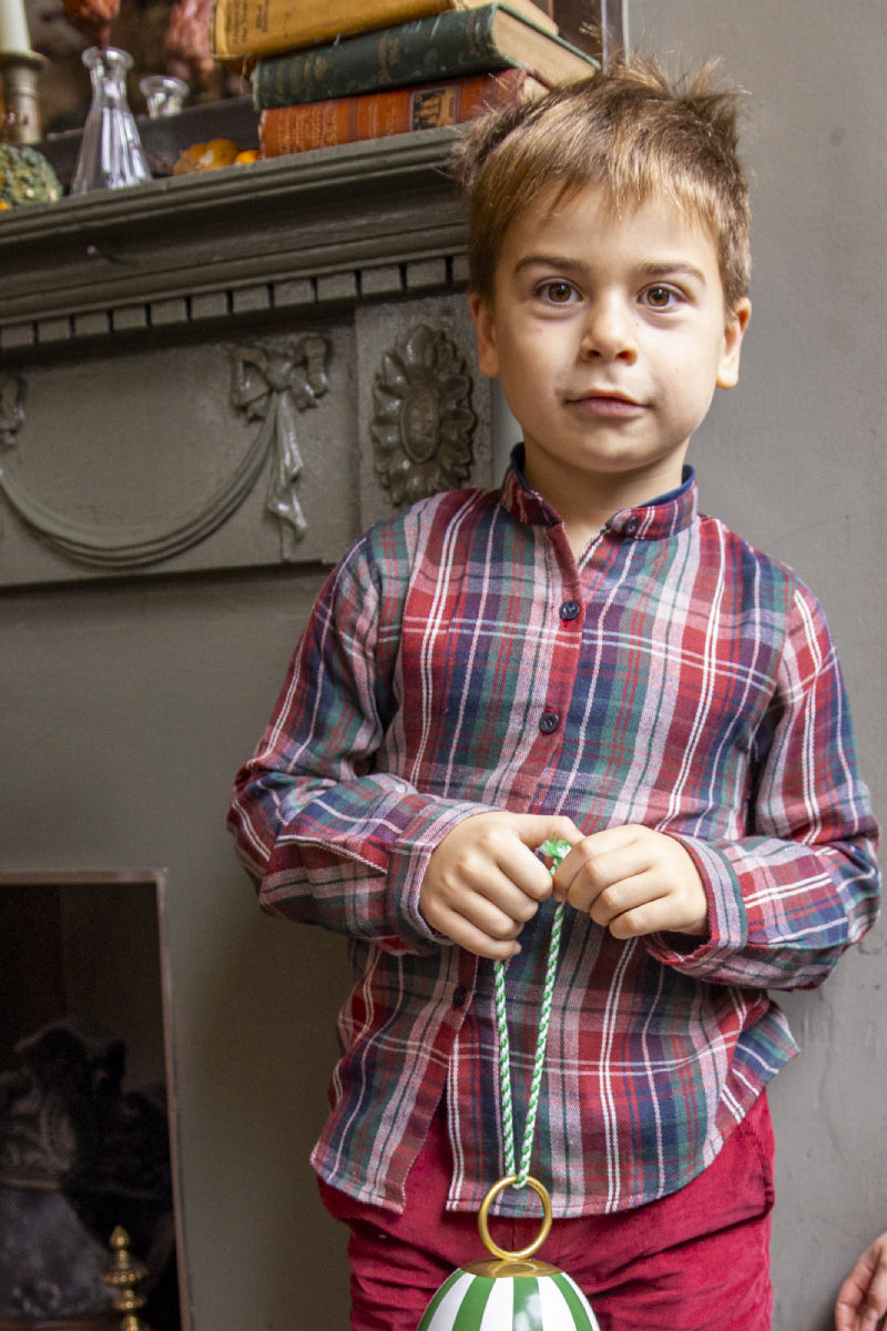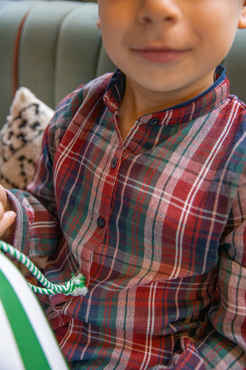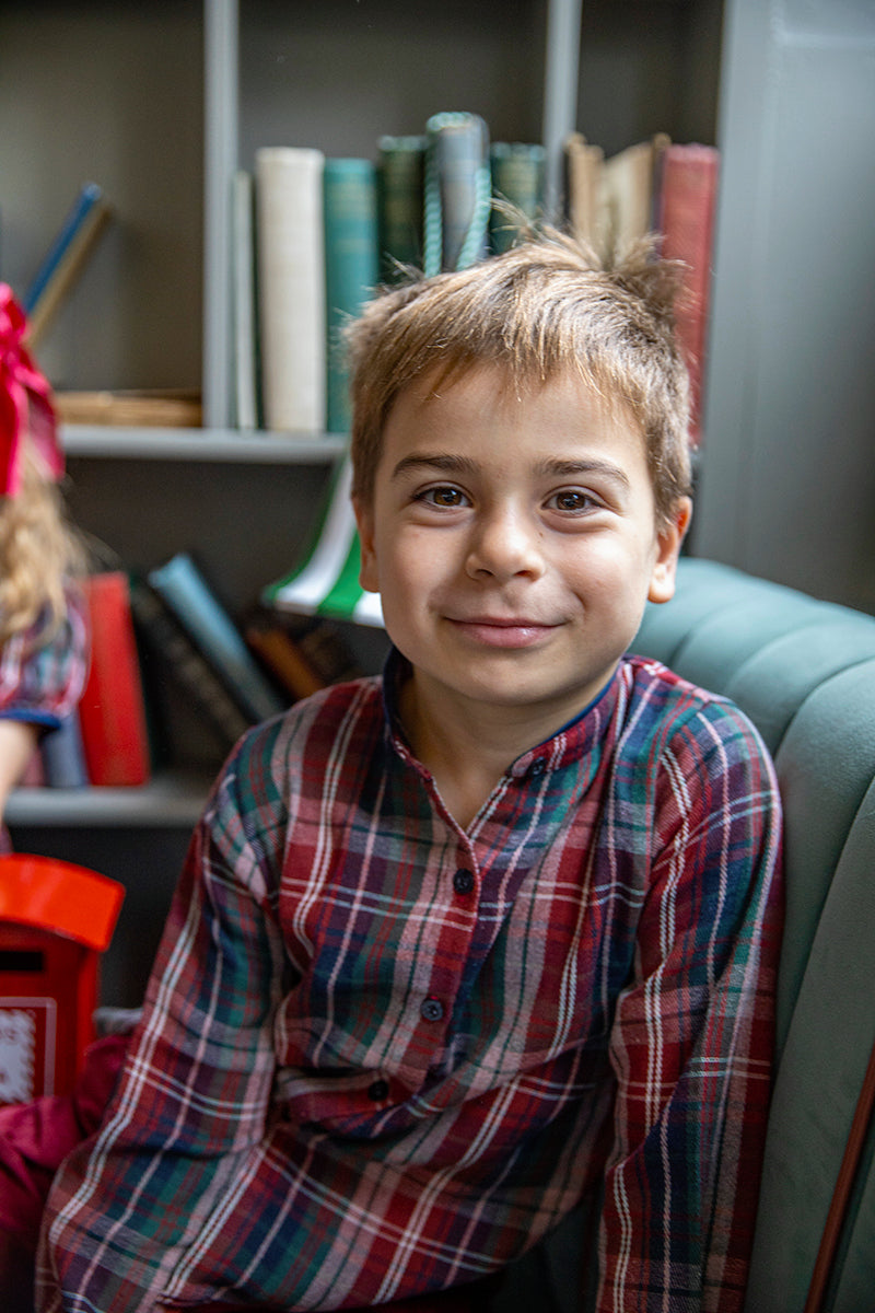 A must-have check shirt for the winter wardrobe of your little boy. It features a classic mandarin collar with navy detail and navy mother of pearl buttons as final touch.