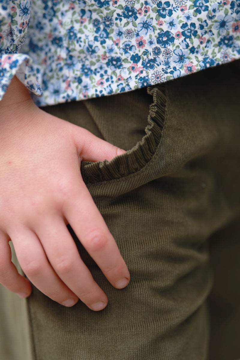 Made from a corduroy fabric in bottle green, they've a frill detail pocket and elasticated waist at back for a better fit.